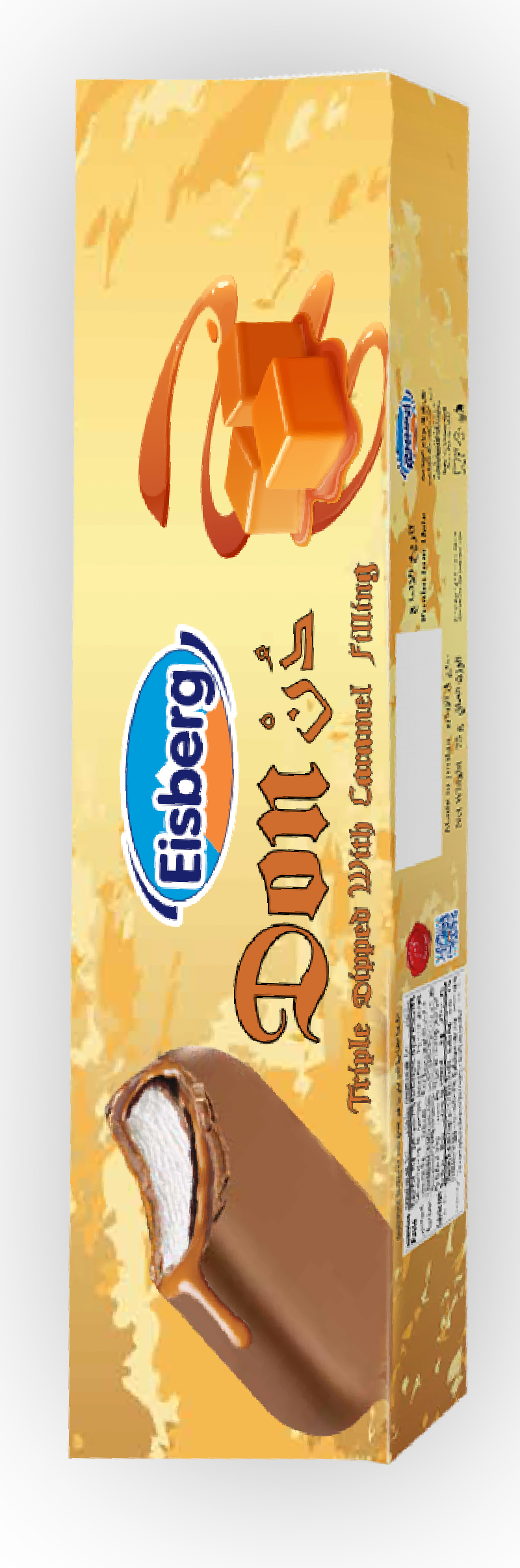 Semi Milk Ice With Vegetable Fat Ingredients: Water, Sugar, Skimmed Cow Milk Powder, Milk Solids, Non Hydrogenated Vegetable Oil (Palm Oil), Glucose Syrup, Edible Emulsifier From Vegetable Source (E471 Mono And Diglycerides Of Fatty Acids From Palm Oil ), Stabilizers From Vegetable Source(E412 Guar Gum From Guar Seeds , E410 Locust Bean Gum , E407 Carrageenan From Red Seaweed ), Vegetable Antioxidant (E 304 Ascorbyl Palmitate From Cassava Root & Palm Tree ), Artificial Antioxidant (E 307 Synthetic Alpha-Tocopherol From Synthetic Vitamin E), atural Identical Flavor (Vanillin) , (Fat Content 10%). Ingradients First Coating ( Chocolate Flavored ): Sugar, Non Hydrogenated Vegetable Oil(Palm Oil), Cocoa Powder , Vegetable Emulsifiers (E476 Polyglycyrol Polyricinoleate From Castor Oil ) , E322 Soya Lecithin ,Salt , Natural Identical Flavor ( Vanillin ) . Ingradients Second Coating ( Caramel Sauce ) : Water , Sugar , Glucose Syrup , Skimmed Cow Milk Powder, Whey Cow Milk Powder, Non hydrogenated Vegetable Oil ( Palm Kernel Oil, , Caramelized Sugar , Edible Emulsifier From Vegetable Oil Source (E471 Mono And Diglycerides Of Fatty Acids From Palm Oil ), Stabilizer From Vegetable Source ( E407 Carrageenan From Red Seaweed ) , Edible Salt, Artificial Flavors (Toffee & Butter ) ,Natural Color( E 150 d Caramel Color ), Primitted Color ( E110 ) . Ingradients Third Coating ( Milk Chocolate) : Sugar, Full Cream Cow Milk Powder, Cocoa Butter, Cocoa Mass, Dairy Ghee, Edible Emulsifiers From Vegetable Source (E476 Polyglycerol Polyricinoleate From Castor Oil , E322 Soya Lecithin ), Edible Salt, Natural Identical Flavor (Vanillin).Ingredients